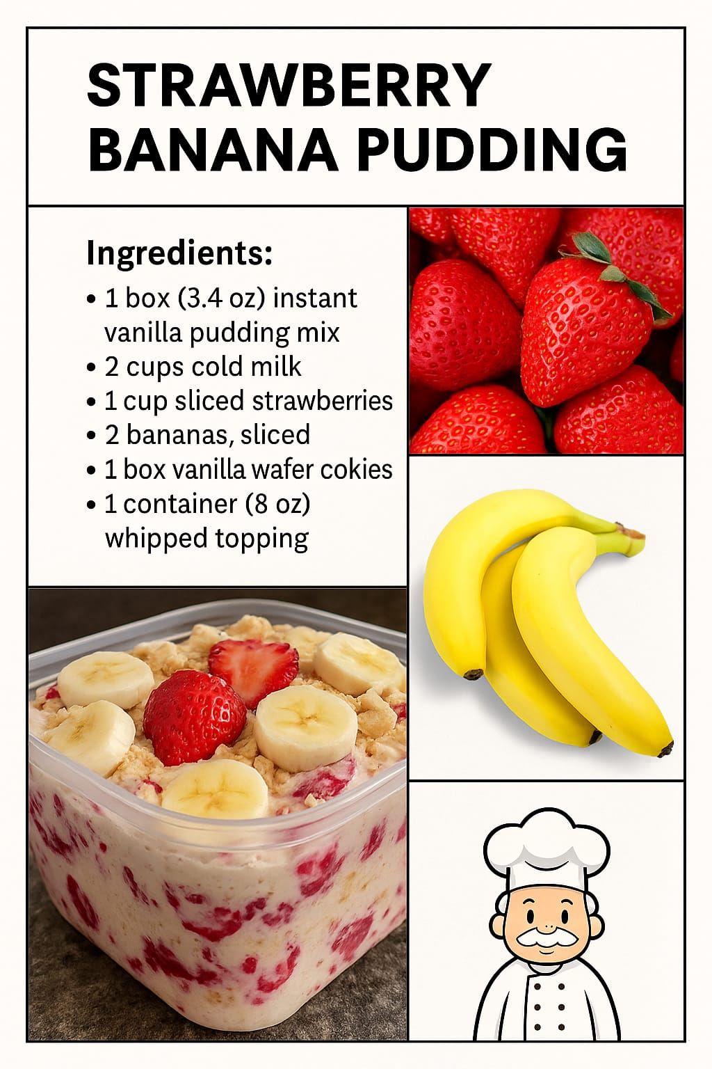 trawberry Banana Pudding is a delightful and refreshing dessert that combines the sweetness of strawberries and the creaminess of bananas with a smooth pudding base. This classic dessert is loved by people of all ages and is perfect for any occasion. Whether you’re hosting a party, preparing a family dinner, or simply craving a sweet treat, this recipe is sure to satisfy your taste buds. With its vibrant colors and delicious flavors, Strawberry Banana Pudding is a crowd-pleaser that will leave everyone asking for seconds.
